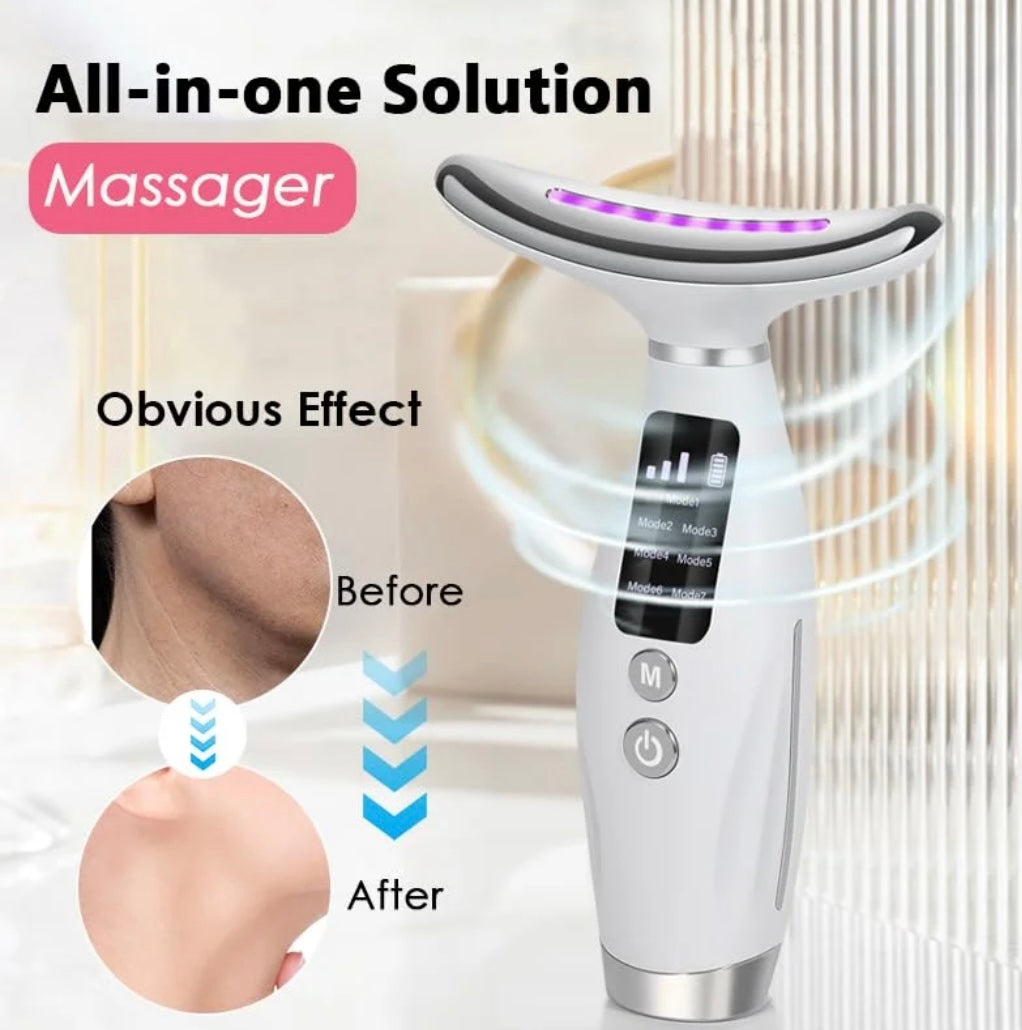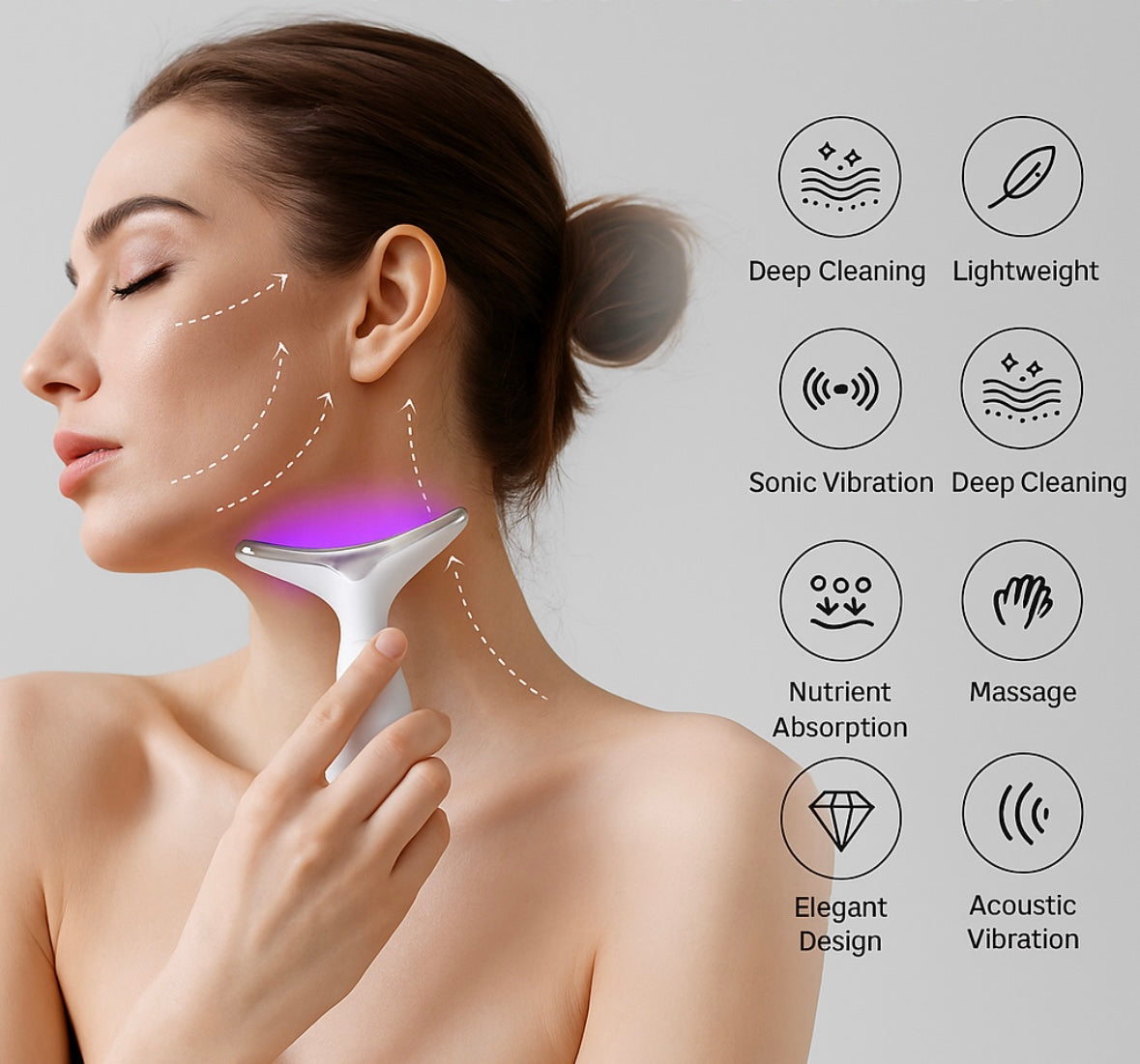 GlowLift™ uses 7-color LED therapy, EMS micro-currents, & acoustic vibration to visibly lift, firm, & smooth your skin — starting from the neck & working upward.
